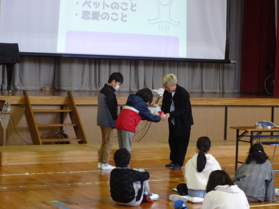 LGBTについて説明いただき、個性の一つであることを学びました。お話の中では、クイズから始まり、自分の生い立ちのことを教えていただきました。また、※トランスジェンダーとして周りからの理解が得られにくかったことや、困難を乗り越えて、二十歳のときに性別適合手術をうけ、ニューヨークや聖火ランナーや浜崎あゆみさんのバックダンサーで活躍したこともうかがいました。