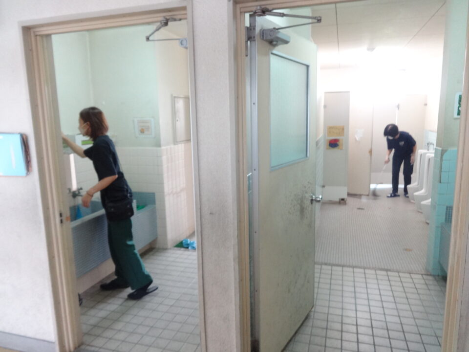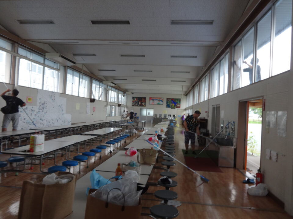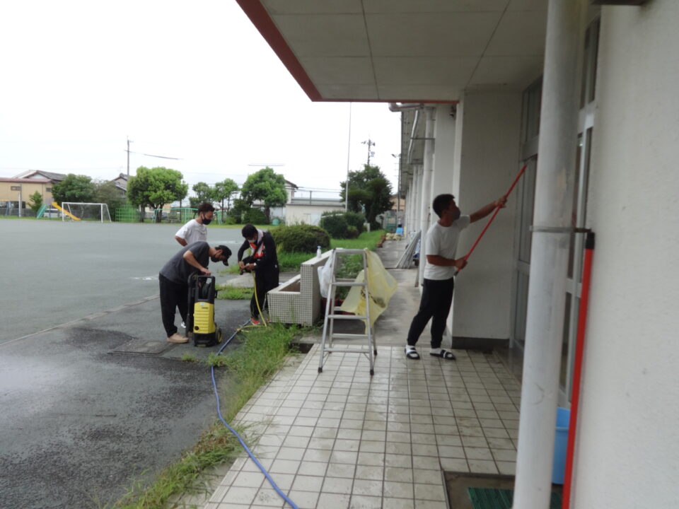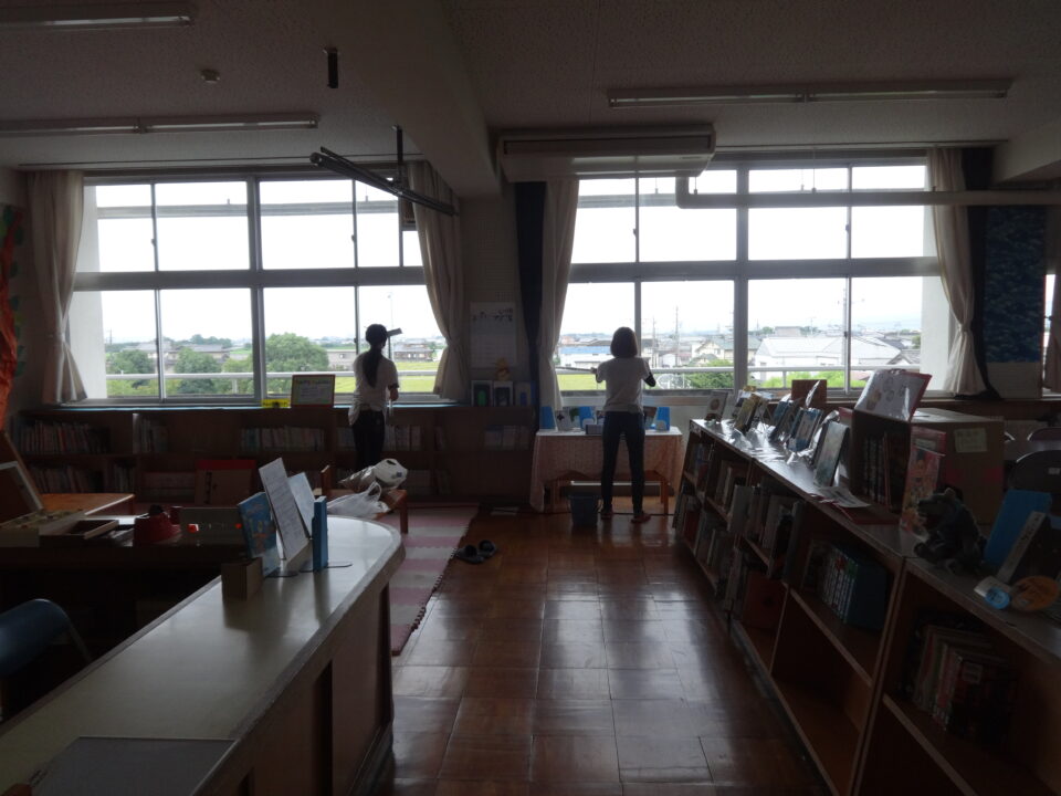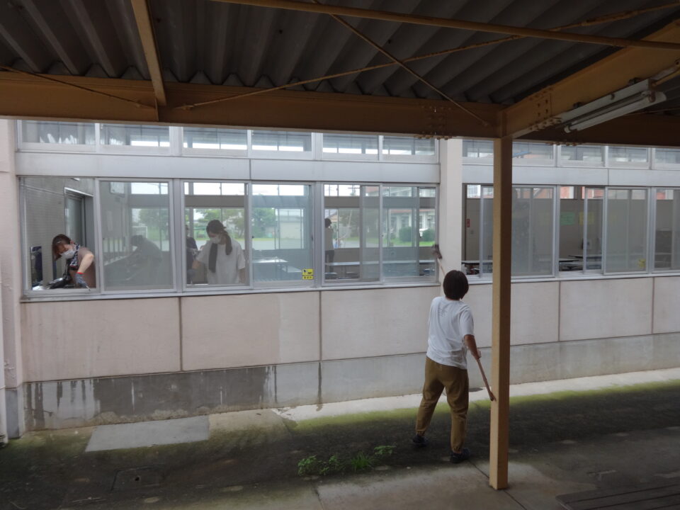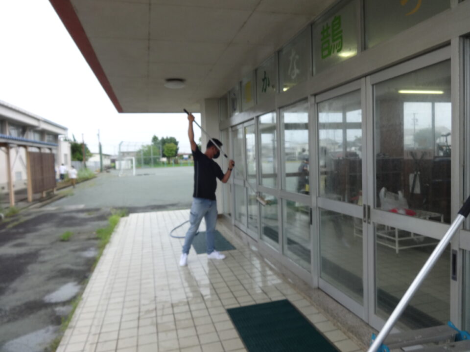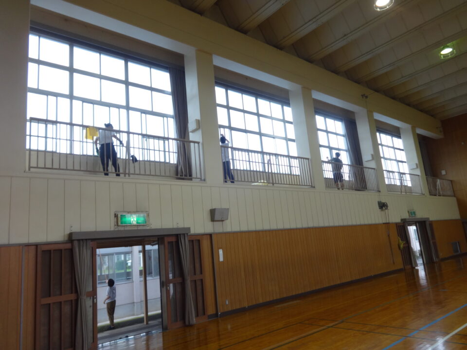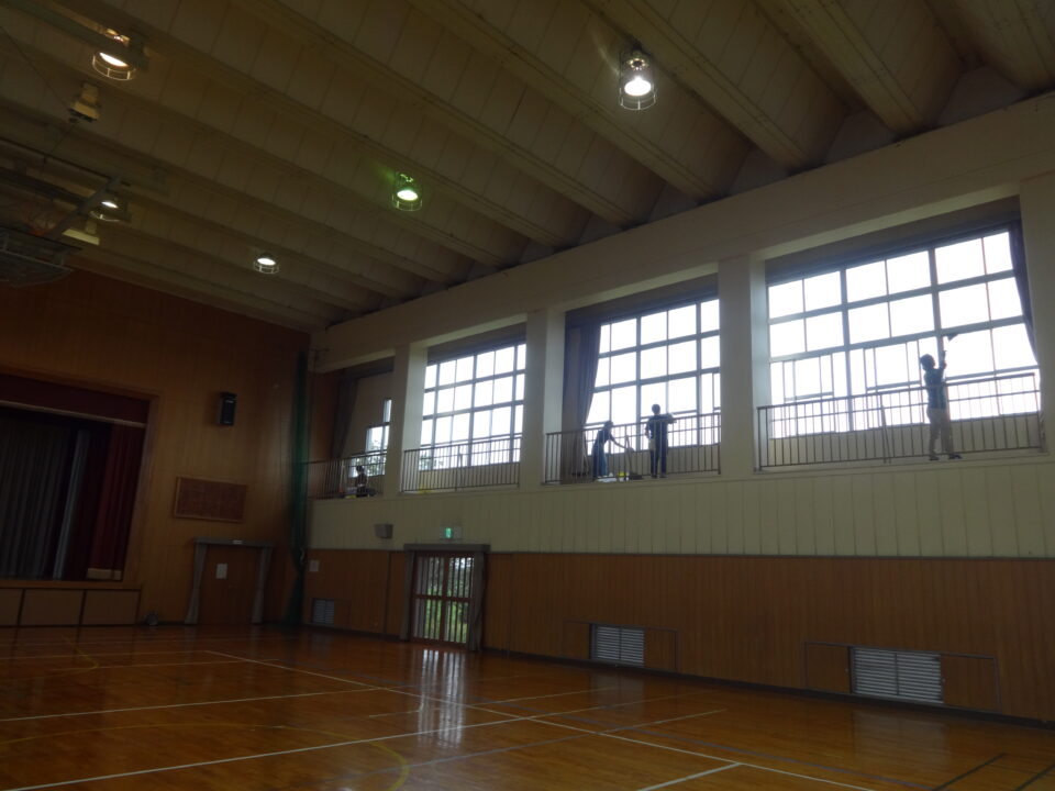今年度は、体育館、ランチルーム、校舎1階、2階、3階の窓拭きや蜘蛛の巣取り、児童トイレ掃除等を行い、きれいにしていただきました。