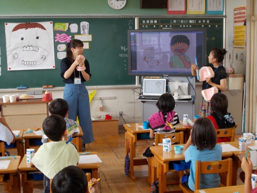 大森歯科医院の大森先生(学校歯科医)とお二人の歯科衛生士さんに、正しい歯磨きの仕方について教えていただきました。まず染め出しをして、磨き残しを各自が確認しました。その後、音楽に合わせて、正しい磨き方をしてみると、子どもたちの歯が真っ白になりました。教えていただいたことを忘れず、丁寧な歯磨きをこれからも続けてほしいものです。