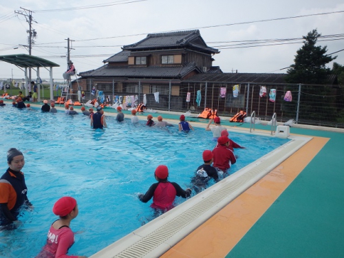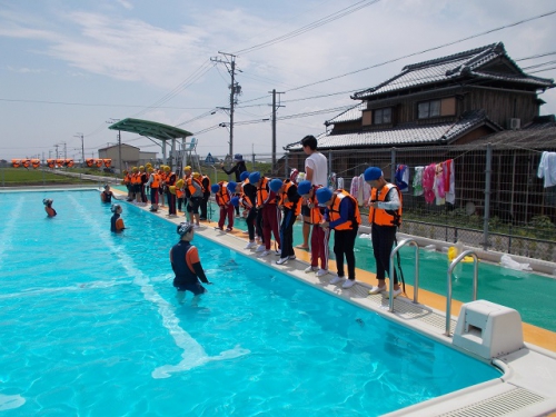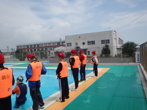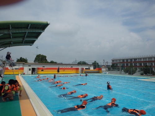 ベスパスイミングスクールのインストラクターの皆さんを講師に迎えて、着衣水泳を行いました。靴を履いたり、服を着たりしていると体がぐっと重くなることを感じ、驚く子どもたちでした。おぼれたときの対処方法やペットボトル等で体を浮かす方法などを教えていただきました。最後に、学校に備え付けのライフジャケットを着用してみました。ライフジャケットを着用していると、長く浮いていられることもよくわかりました。防災訓練でも着用していますが、子どもたちはスムーズに着用できるようになりました。