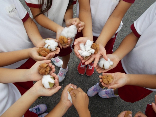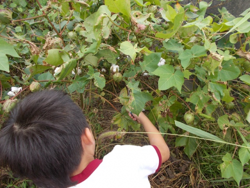 1年生が綿の収穫をしました。1年生15人が2つずつとりました。子どもたちは、触ったり顔に押しつけたりして、ふわふわの感触を楽しんでいました。「ぬいぐるみみたい。」「お寿司みたい。」と言う声も聞こえてきました。まだたくさん実がなっています。もっととれそうです。