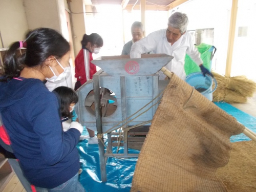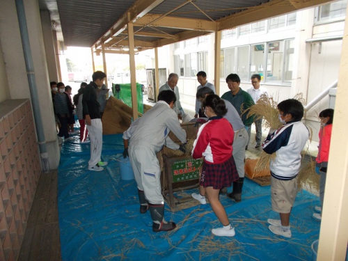 先月稲刈りをし、はざかけをして乾燥させた稲を、5年生が脱穀をしました。千歯こきや足踏み脱穀機、とうみなど昔の道具を使って、体験させていただきました。教科書に出てくる昔の道具を実際に体験できるというのは、子どもたちにとっては貴重な勉強です。地域の皆さんに大変お世話になりました。