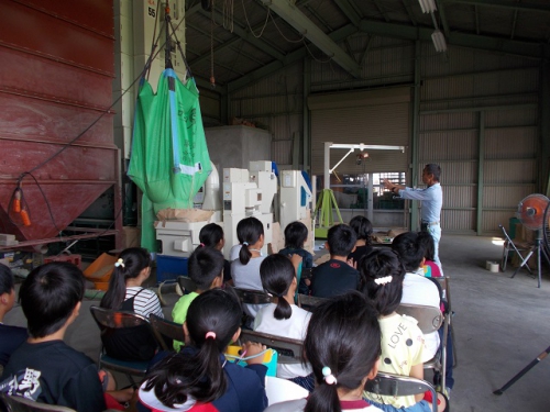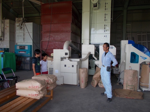 5年生が、もみすりの様子を見学させていただきました。初めに、もみまきから米になるまでの説明をしていただきました。次に、大きなもみすりの機械の説明をしていただいた後、実際に機械を作動させていただき、間近で見せていただきました。ほとんどの子どもたちが、もみすりの工程を見るのは初めてでしたので、興味津々で機械をのぞき込んでいました。