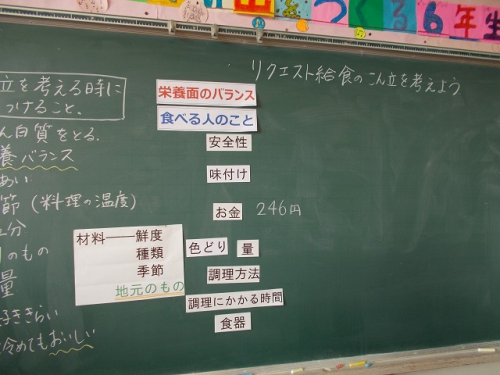 11月7日、高木栄養教諭から食育の授業を受けました。各校の子どもたちの希望を取り入れてもらえるリクエスト給食に向けて、6年生が、献立について考えました。好みだけでなく栄養のバランスなどいろいろな条件を考えながら、みんなで献立を作り上げていきます。