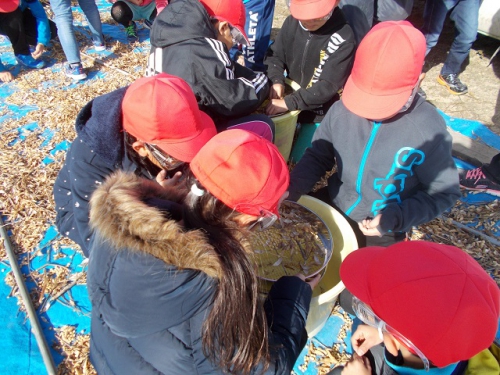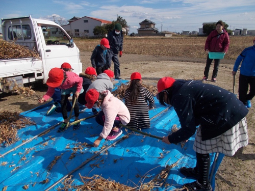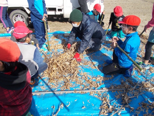 星合環境保全協議会の野田さんにお世話になり、3年生が、大豆の収穫をさせていただきました。竹の棒でたたいて大豆を鞘からとり、ふるいにかけて豆を選別します。寒い中でしたが、子どもたちは、夢中で作業をしていました。収穫した大豆で、豆腐作りをする予定です。