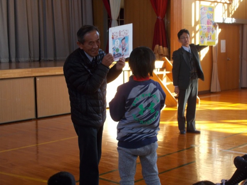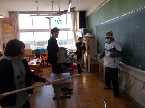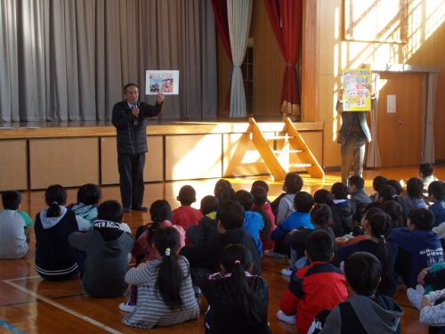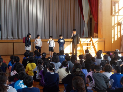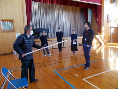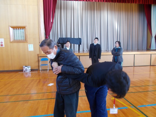 松阪警察署生活安全課のお二人に来ていただき訓練をしました。5年生の教室に、不審者が侵入したという想定で行いました。子どもたちは、放送や担任の指示を聞いて、すばやく体育館に避難しました。その後、体育館で不審者に出会った時の対応についてご指導いただきました。子どもたちだけでなく、私たち職員も、実際にさすまたを使って不審者を取り押さえる練習をしました。