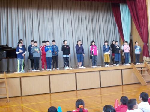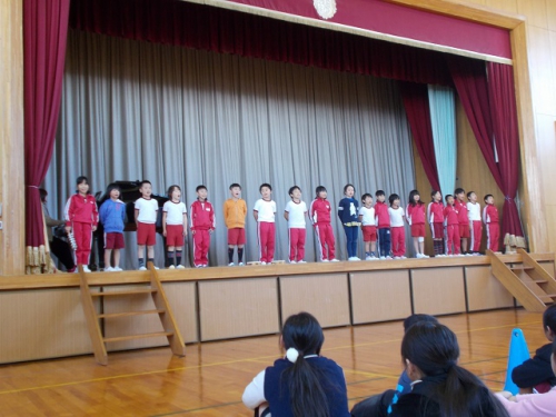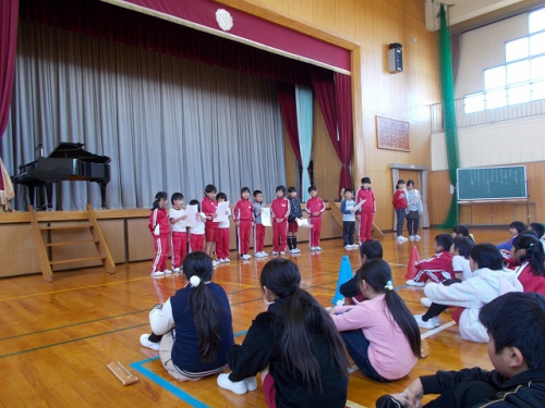 12月6日5限目に、児童集会が行われました。いつものように校歌をみんなで歌った後、今月の生活目標について、各学年の取り組みが発表されました。その後、2年生と5年生の発表がありました。2年生は、クリスマスの歌を、楽器を使いながら2曲歌いました。元気いっぱいのすてきな歌声でした。5年生はリコーダーの演奏と手話を使った歌を歌いました。手話は自分たちで考え、みんなで教えあって練習してきました。見事でした。見ている他学年の子どもたちも、手話をまねて歌いました。最後は、2年生がブラジルの遊びを、全校に教えてくれました。難しい手遊びでしたが、みんな上手にできるようになりました。