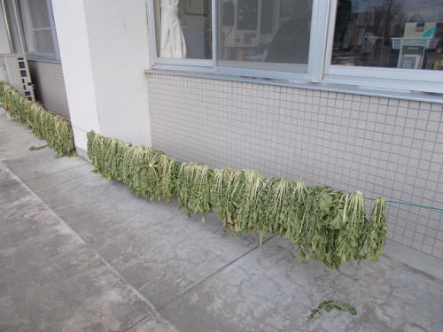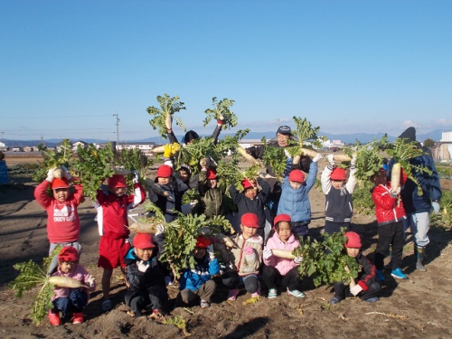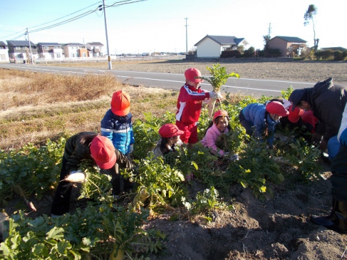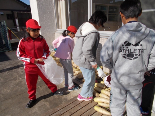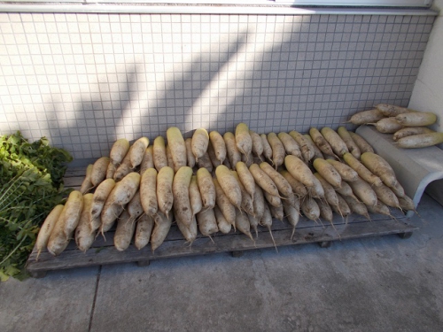 12月18日、地域の皆さんにお世話になり、1年生が大根の収穫体験をしました。子どもたちは、地域の方に大根のひき方のコツを教えていただき、上手に大根をひいていました。たくさんあった大根があっという間に収穫できました。欲しい子は2本ずつ持ちかえりました。「昨夜おでんを作ってもらったよ。」と報告してくれた子もいます。大根の葉は、メイカの餌にするため干しています。