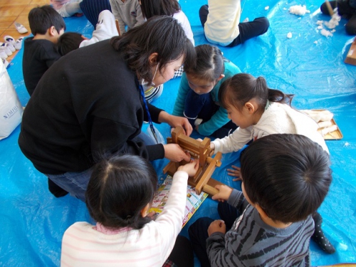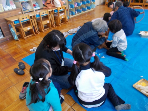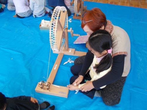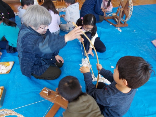 松阪もめん手織り伝承グループゆうづる会の皆様に来ていただき、1年生が、糸紡ぎ体験をさせていただきました。綿繰りや綿打ちも、道具をもってきていただき、体験させていただきました。自分たちが栽培・収穫した綿が、糸になるまでを、実際に見て、体験することができました。やってみるとやはり難しく、なかなか上手にはできませんでしたが、子どもたちは大喜びでそれぞれの作業をさせていただいていました。