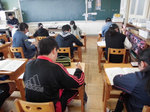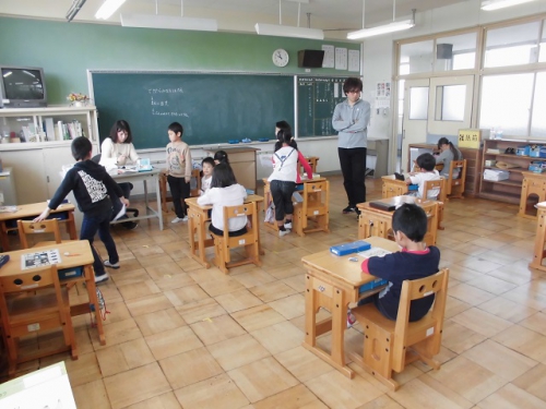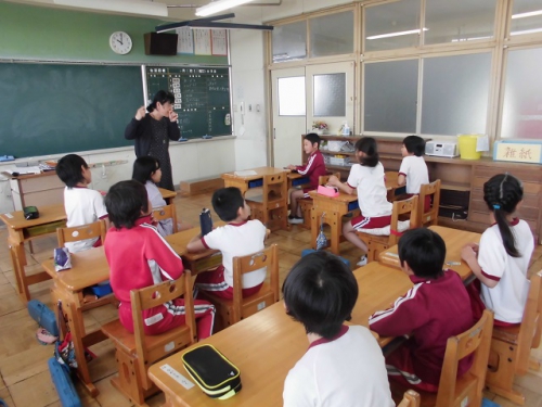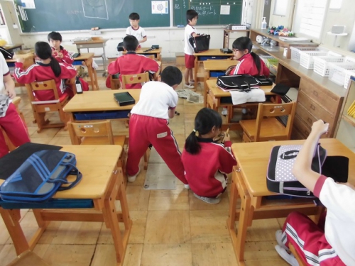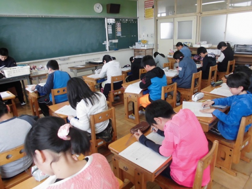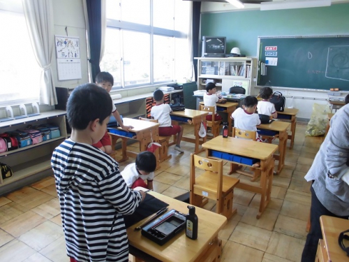 1年生の教室も作品などが増えてにぎやかになってきました。きちんと座って先生のお話を聞いています。2年生も静かな授業風景です。3年生は習字の片付けをきちんとしていました。4年生の音楽ではサザンの歌も聴こえてきました。6年生は集中して算数の問題にチャレンジしていました。