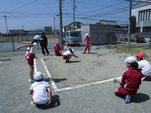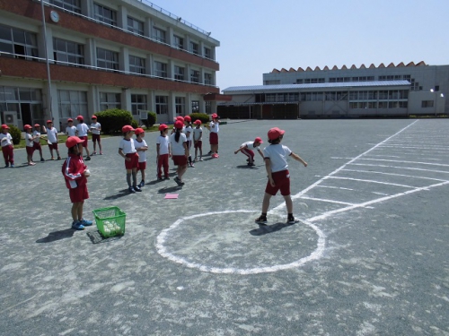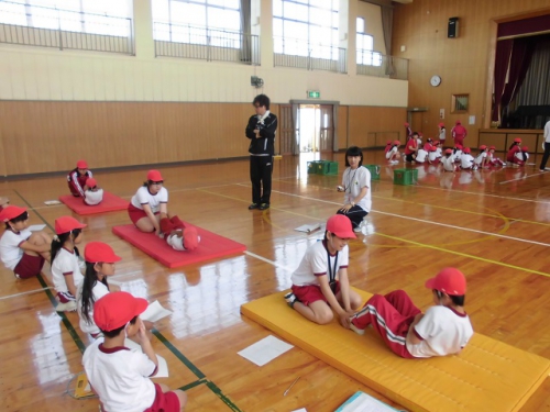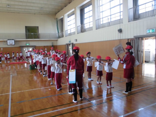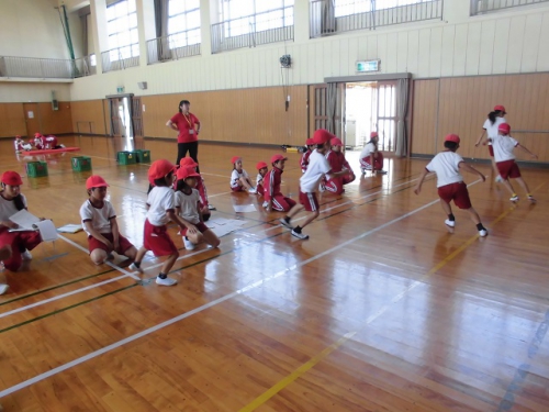 五月晴れに恵まれ、全校児童が運動場と体育館で新体力テストを行いました。たてわりグループ「レインボー鵲」の4グループに分かれて、6年生のリーダーの指示で5つの種目を行いました。上級生のやり方を見本にして、下級生も一生懸命体力に取り組みました。さわやかな風がとても心地よい日でした。