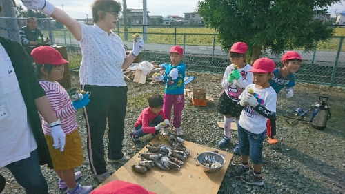 今日は笠松環境保全協議会のヤキイモスペシャリストのみなさんに来ていただいて焼き方を教えてもらいました。1年生がぬれた新聞紙とアルミホイルでつつんだイモに金具さして、ドラム缶の上部の格子につり下げて焼きました。30分もするとヤキイモのいいにおいがしてきました。およそ40分で焼き上がり、焼きたてをいただきました。甘く、おいしい栗のような味に感激しました。やはり焼き方によってもイモの味は違うようです。1年生は日頃のお礼に、各学年に配って食べてもらいました。ありがとうございました。