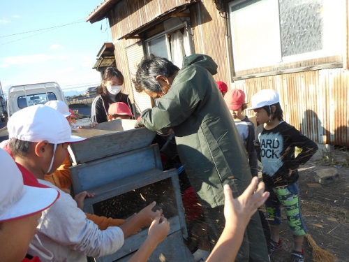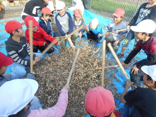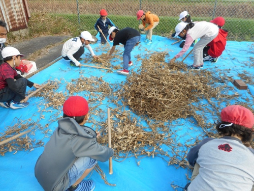 3年生は5・6限の総合の時間に野田さんに来てもらって、大豆の実取りをしました。9日に畑から運んできた大豆のさやから実を取り出す作業です。昔ながらの「とうみ」や「み」、「からさお」を使ってみんなで汗をかいて集めた大豆の実は宝石のように輝いて見えました。