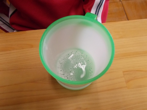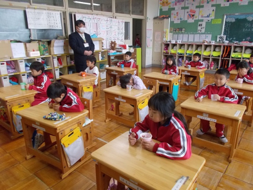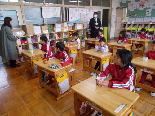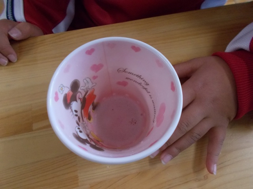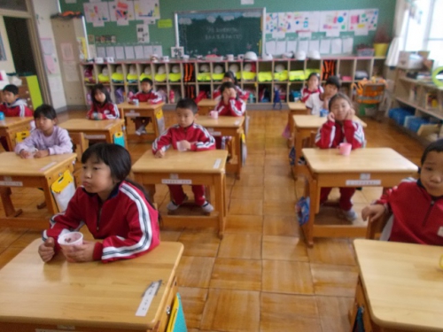 今日から一年生は月曜日の朝の会の時間にフッ化物によるブクブクうがいを始めました。水で練習はしてきたものの、薬品を実際に使用してのうがいは今日からで、一年生は少し緊張した表情をしていましたが、CDが始まるとコップの薬品を口に含んで、音楽に合わせてうがいを始めました。うがいの後はコップに戻してあわの具合で上手にできたか確かめました。次回は12月7日(金)です。基本毎週金曜日に行います。これを機会に歯を大切にし、80歳になっても自分の歯が20本以上残っているように手入れや、食べ物のとり方に注意していきましょう。
