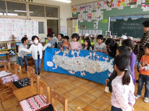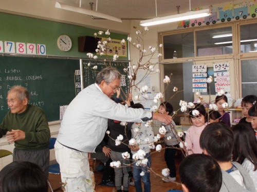 1年生は生活科の時間にわたの栽培から、わたをつかってできることの学習をしました。今日はわたのことでいろいろお世話になっている笑びすや農園のみなさんに来ていただいて、立派なわたの木や、わたから糸をよってつくる道具、そしてわたの繊維で織った敷物などを見せてもらいました。ふわふわのわたが丈夫な糸になって、それを織るときれいな布になることを知りました。お礼にいただいたわたを使って、みんなで協力して作った「くじらぐも」を見てもらったり、「ぞうれっしゃよはしれ」を歌いました。ありがとうございました。