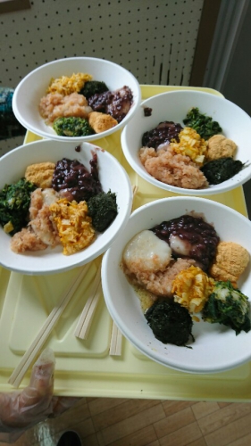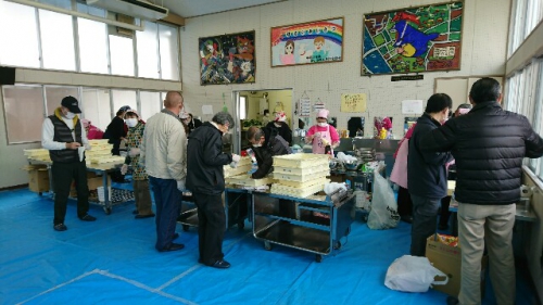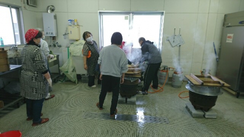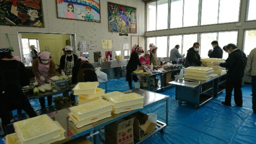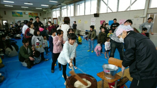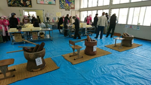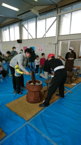 本日10時より、鵲小学校ランチルームにて鵲まちづくり協議会主催のもちつき大会が開催されます。朝からたくさんの地域の方が準備をされていました。昔ながらのきねとうすでついたつきたてのおもちを味わってください。六種類の味が用意されているようです。PTA会長さんも手返しに奮闘されていました。