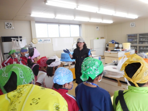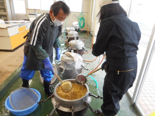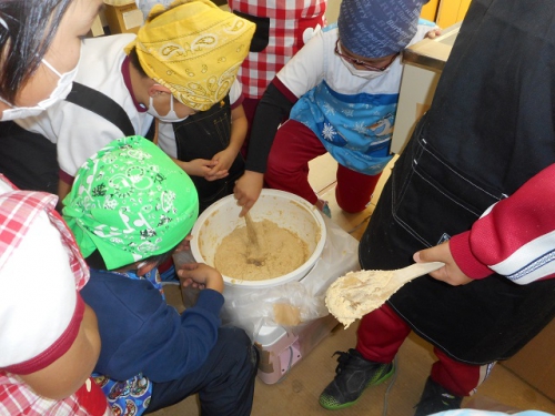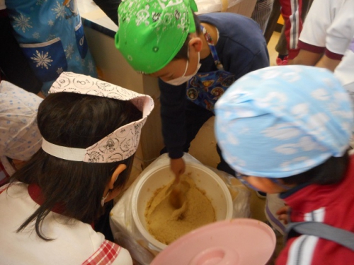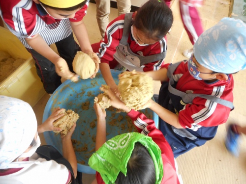 28日午後3年生はJA一志東部さんのお世話になって味噌作り体験をさせてもらいました。総合学習で大豆からできるものを学んでいます。場所は振興局のバスに乗せてもらってグリーンセンターにある加工場です。蒸した大豆をつぶして塩・麹菌を混ぜ合わせた玄米を混ぜ込むという単純な作業でしたが、みんなでこねたり丸めたりして楽しみました。おいしいお味噌のできあがりは今年11月くらいになりそうです。