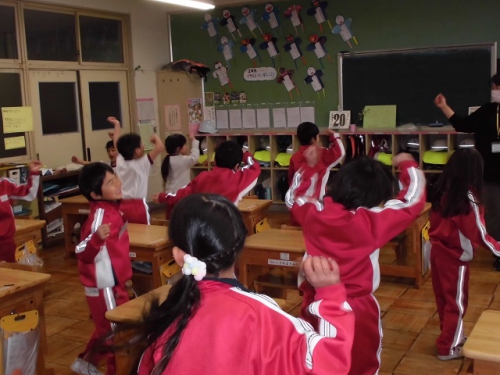 1年生はALTのデビキ先生に英語活動をしてもらいました。英語の歌に合わせてからだを動かしたり、自分の好きな果物を英語で答えたりしました。こどもたはデビキ先生をまねてとてもよい発音ができていて驚きました。楽しく元気に英語活動ができていました。