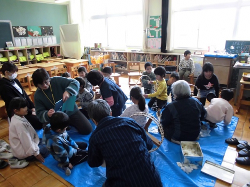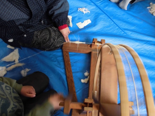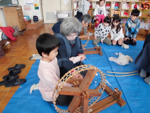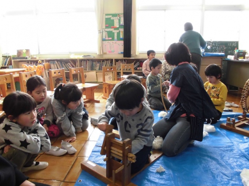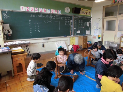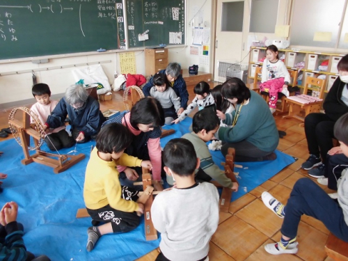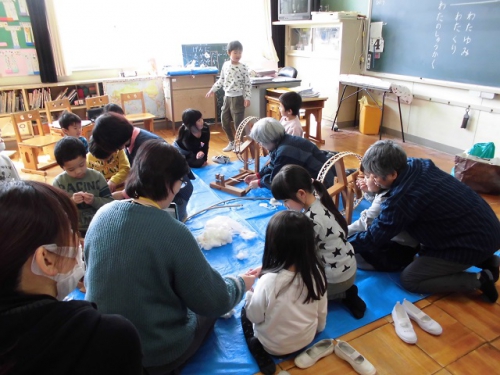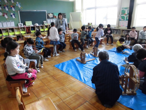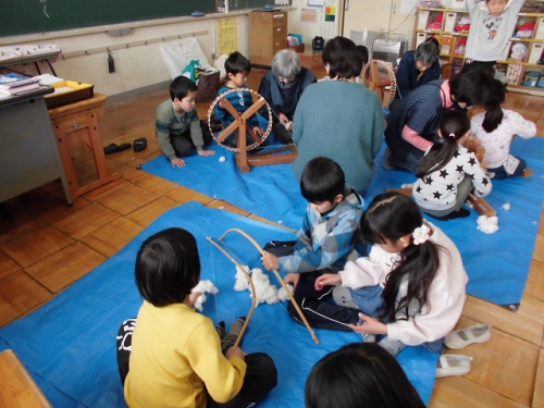 1年生はわたから糸を作る伝統工芸を松阪市のゆうづる会の方に来ていただいて教えてもらいました。わたの花を使っての学習の続きです。「わたくり」や「わたゆみ」を使ってふわふわにしたわたをよじって糸にしていきます。アニメ日本昔ばなしでしか見たことがない「糸車」に感激です。大きな輪を回転させて、小さな輪を高速回転させてよじっていきます。ふわふわの綿の繊維が絡まり合って一本の強い糸になっていく様子を見て人と人との関係もこんな風に強くなっていくとよいなと感じました。松阪木綿はこうしてできた糸を染めて、織ってできているそうです。
