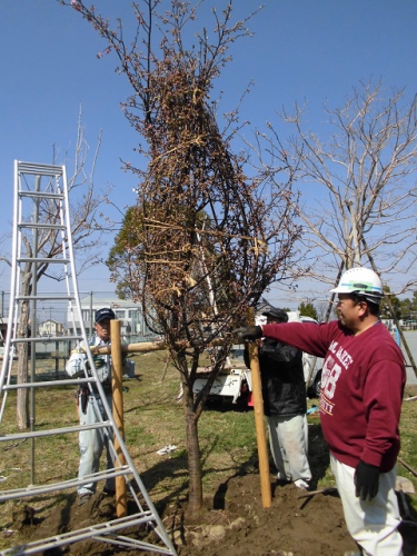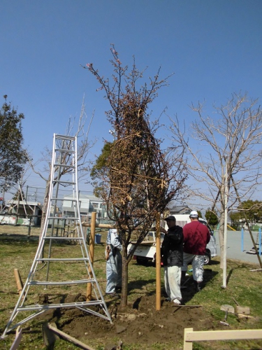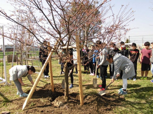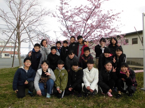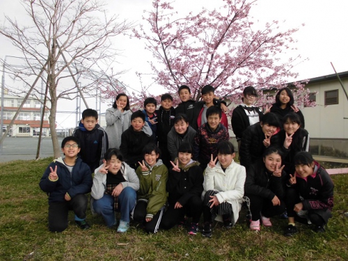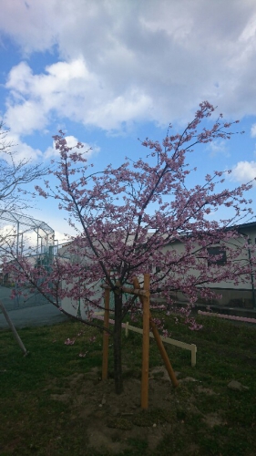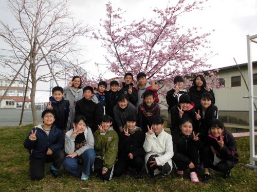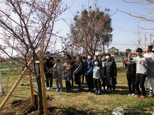 今日は公益財団法人 原田積善会より寄贈いただいた河津桜を6年生がかささぎの森に記念植樹しました。平成30年度卒業生記念植樹の札もちゃんとつけてもらってあります。とても大きくて花のつぼみがたくさんついていて、あと少しで満開を迎えそうです。かささぎの森がまたにぎやかになりますね。卒業生の思い出の樹として大切にしていきます。卒業式前に桜が満開になったところで記念撮影しました。卒業式まで花がもってくれたらよいですね。