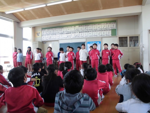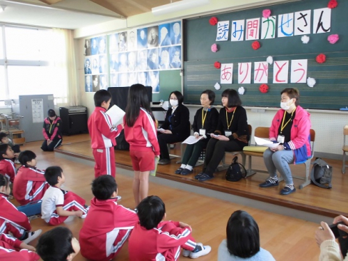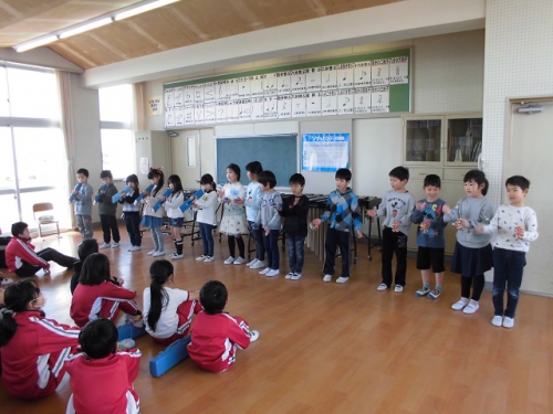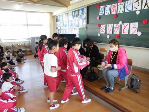 コミュニティスクール推進員会読書活動部の読み聞かせボランティアの方に来ていただいて、読み聞かせさん感謝集会を音楽室で行いました。1年生、2年生、3年生が日頃の感謝の気持ちを込めて、楽器を演奏したり、歌を歌ったり、手紙を読んで渡しました。3年生が進行をして、いろいろ気配りしてうまくすすめることができました。朝の読み聞かせは月曜日の朝お世話になっています。子どもたちが本に興味を持ち、読書する気持ちになることを願っています。3月15日に男子4人目の読書超人が誕生しました。