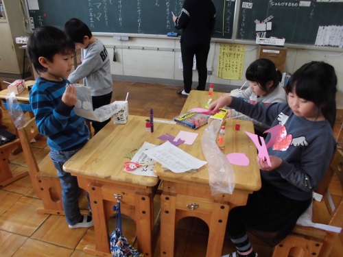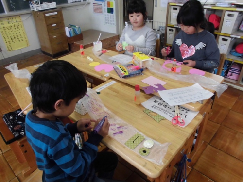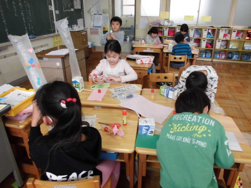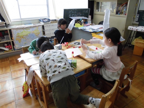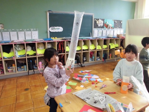 1年生が図工の時間に、ストローで息を吹き込むとビニールの筒がふくらんで、伸びて箱から飛び出すおもちゃを作っていました。ビニールに絵や文字を描いたり、紙をはったりいろいろと工夫をしていました。家族へのメッセージもあり、入学後1年近くがたって、ずいぶん成長しているなと思いました。