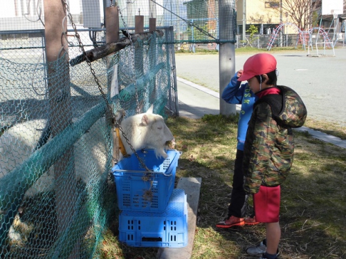 1年生に今日はメイカの誕生日だよと教えてもらいました。2008年4月16日生まれの11歳です。メイカの名は鳴き声の「メイ」とかささぎの「カ」を取って名付けられたそうです。鵲の森の主として11年間牧場の草を食べ続けてくれています。飼育委員会や教職員が毎日小屋の掃除やえさやり、バケツの水替えをしています。寒い冬を乗り越え、これから草の豊富な初夏を迎えます。メイカの「メイ」は命の「メイ」と思ってこれからもみんなで大事に育てていきましょう。