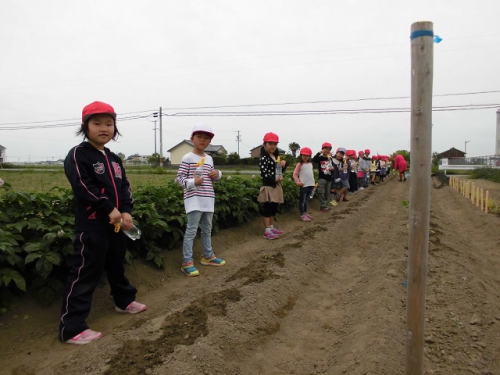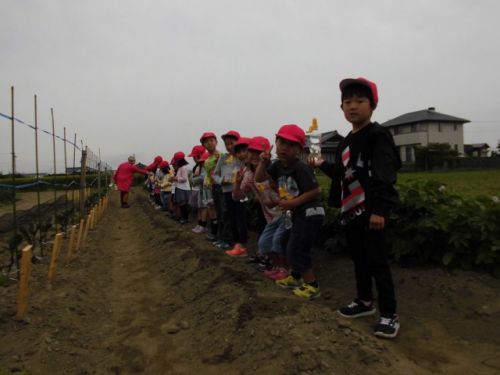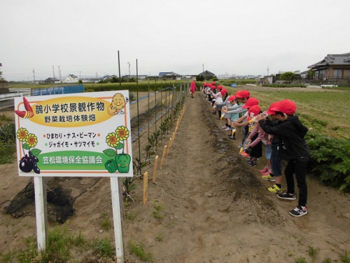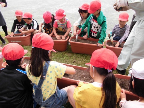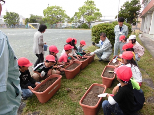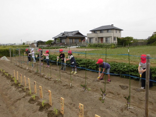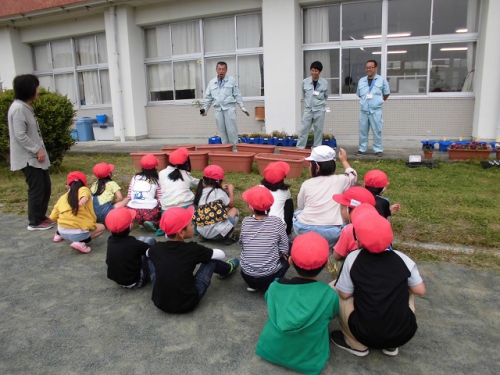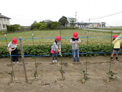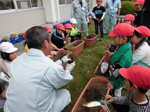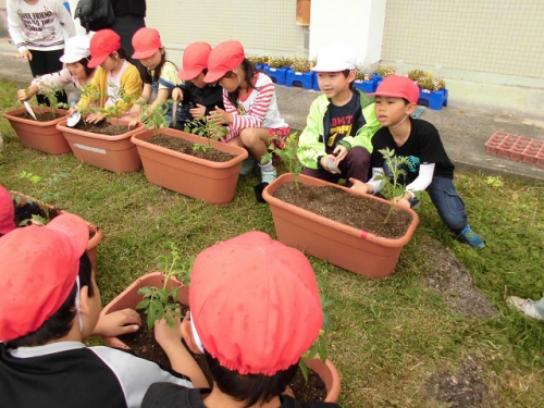 1年生は朝から先日植えたサツマイモの苗に水やりをしました。水不足で元気のなかった苗も1年生から水をもらって元気になったことでしょう。2年生は桃太郎トマト栽培に挑戦します。JA一志東部から出前講座に来ていただいて、トマトの苗植えをしました。目の届き安い校舎の前の芝生にプランターを置きました。しっかりお世話をして桃太郎トマトが楽しみです。