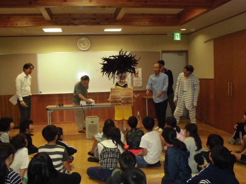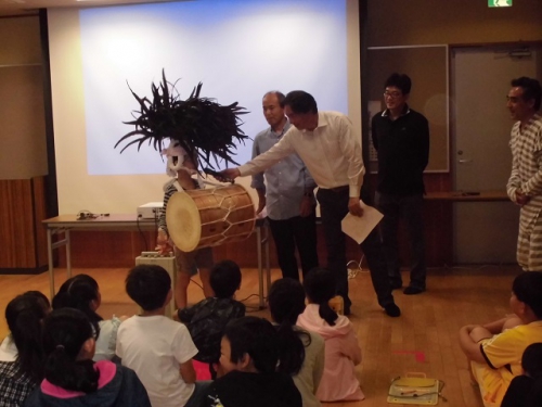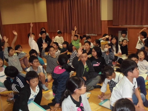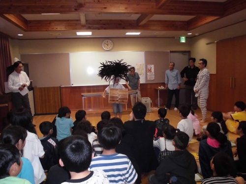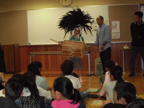 今日は土曜授業日です。3年生から6年生までが鵲公民館で、笠松かんこ踊り保存会の方に来てもらって話を聞いたり、ビデオをみたり、質問をしたり、実際に太鼓やかぶとを身につけさせてもらいました。