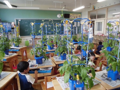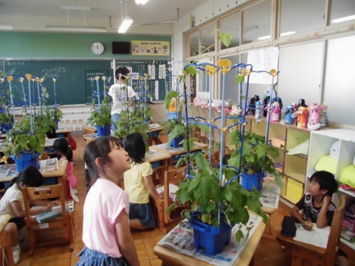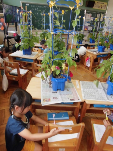 鉢植えのアサガオが開花しました。1年生は教室に鉢を持ち込んで成長を記録しました。教室はアサガオでジャングルに入ったような様子でした。アサガオの花もいくつか見られました。毎朝水やりをして大切に育ててきたアサガオです。きれいな花を咲かせてくれるでしょうね。