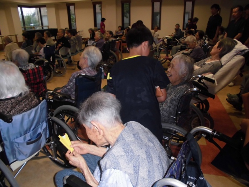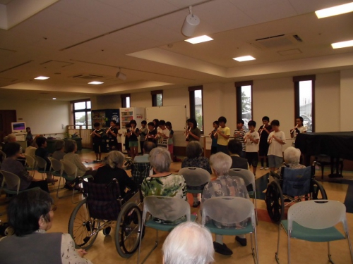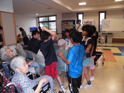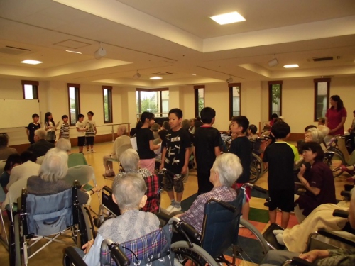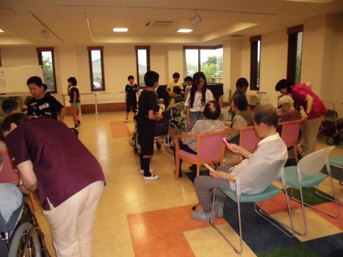 4年生19名は毎年恒例の第二吉祥苑訪問に行ってきました。会場の1階のホールには車椅子に乗った入所者がどんどん集まってきました。最初は少し緊張しましたが、みんなでパブリカを歌って踊ったので、緊張がほぐれたようで、あとは進行役がうまくすすめてくれました。ブラジルの手遊びや4年生の個性を発揮した〇×クイズ等を入所者や働いている方々に楽しんでいただきました。最後に「花は咲く」をみんなで歌って、手紙を渡して終了となりました。第二吉祥苑のみなさんありがとうございました。秋にまたお邪魔します。
