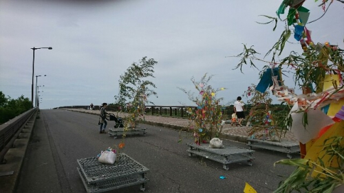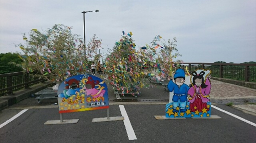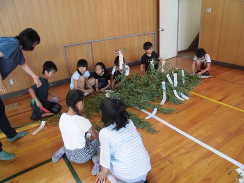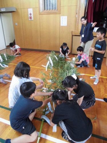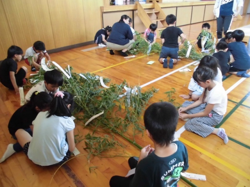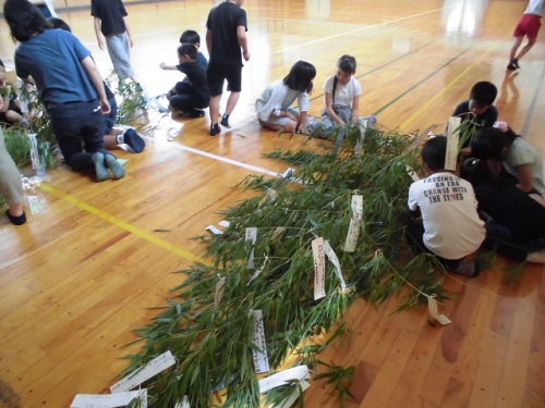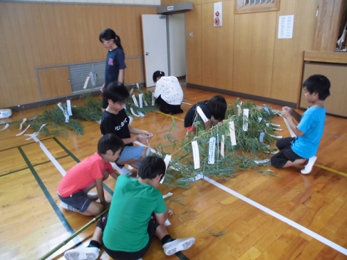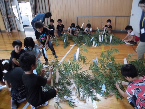 7月5日の七夕集会に向けて準備をすすめました。6年生は恒例のかささぎ七夕伝説を演じてくれます。どの学年も発表に向けてがんばってきました。ぜひお越しください。地域の方に用意してもらった笹竹にそれぞれが願い事を結びつけました。体育館ステージ前に置いてあります。七夕集会終了後は、7日に雲出橋で行われるみくも七夕笹飾りに展示します。晴れたらいいな。7日(日)午後4時頃雲出橋上に笹飾りを展示しに行きました。みなさんの願いが通じたのか、七夕は晴れて彦星・織姫は無事に会うことができたようです。めでたしめでたし。