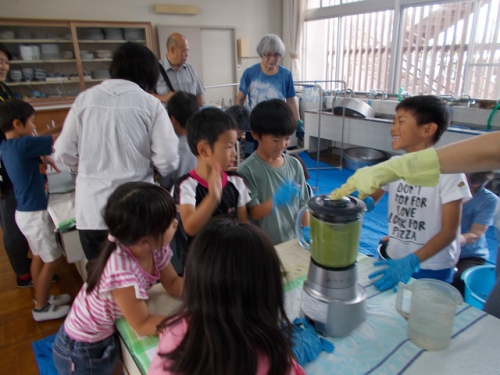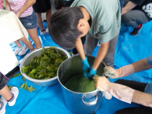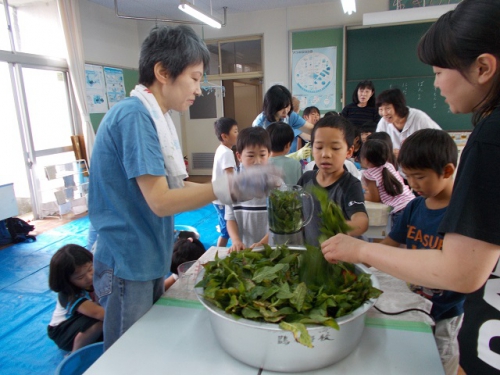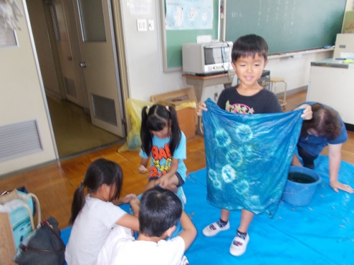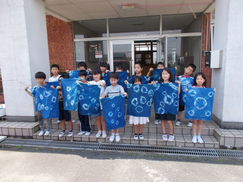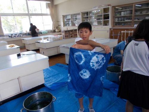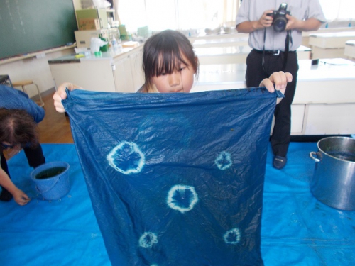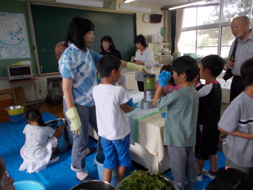 2年生はゆうづる会の方5人に来てもらって、家庭科室で藍染め体験をしました。学級園に栽培してあった藍の葉っぱをミキサーで粉々につぶして葉の中の色素を絞り出します。緑色の葉っぱなのですが、絞り出すと鮮やかなジャパンブルー(藍色)になってきました。世界に一つしかないざぶとんカバーができあがります。カバーの中には1年生の時に学んだわたを入れるということです。