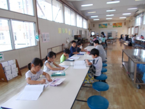 夏休みに入ってようやく明るい日差しが見られるようになってきました。一斉にセミの鳴き声もしてきました。梅雨明けは間近のようです。子どもたちは9時からランチルームへ学習に来ています。今週金曜日まで実施しますので、利用してください。エアコンも効いています。夏野菜もうまく育ちました。