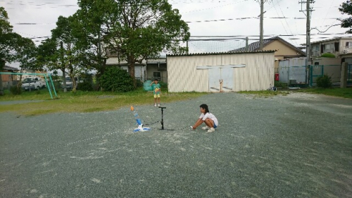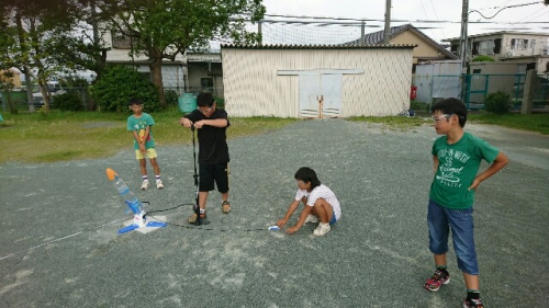 明日8月10日は松阪ペットボトル大会です。鵲小学校チーム鵲レインボーはメンバー四人で最終打ち上げ練習をしました。目標地点に正確に飛ばすためにみんなで考えました。ロケットの名前はNIJI-KASRです。明日の会場は県営松阪球場です。がんばってきます。