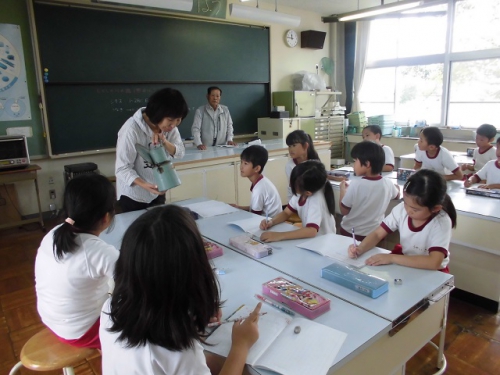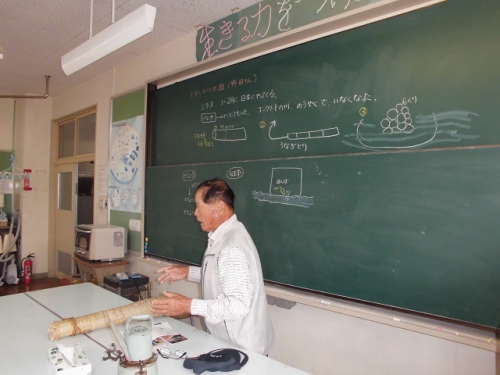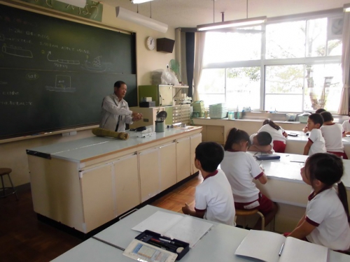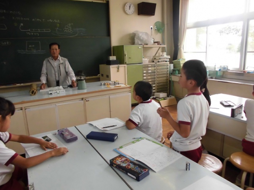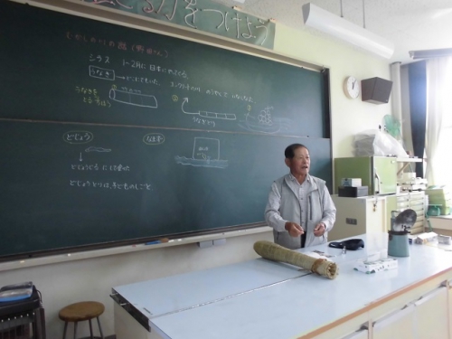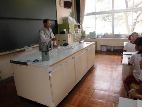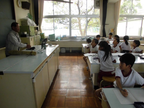 前回のうなぎの養殖の出前授業に続いて、今日は地域の方に来ていただいて、川でうなぎを捕まえた昔の話を伺いました。暗い中で捕獲するための昔のライトや仕掛けたワナなどを見せてもらって、天然のうなぎは美味しかったと聞かせていただきました。美味しいうなぎを食べるために人は知恵を絞って、苦労していることを地域の方々から学ばせてもらっています。子どもたちは疑問に思ったことを質問したり、教わったことをノートにしっかりとまとめています。聞きとったり、書いたりする力をつけていきます。ありがとうございました。