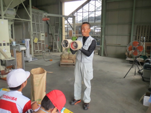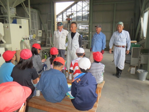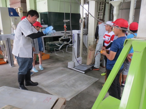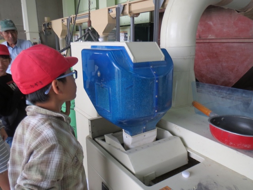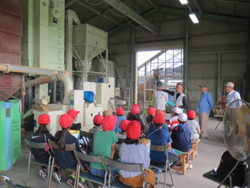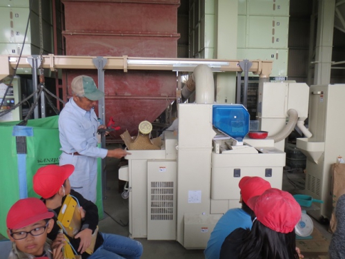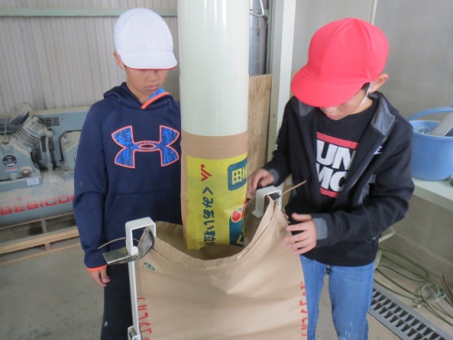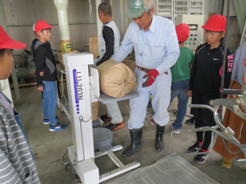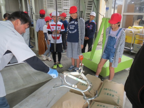 10日午前に5年生は笠松営農組合の倉庫に行き、もみすりについて学習しました。稲の収穫、脱穀そしていよいよもみすりをしてもみを食べられる状態にする過程を地域の方々から教わりました。たくさんのもみをもみすりするために大きな機械を動かしていたり、またできあがった玄米を袋詰めして運ぶ時に、作業が簡単にできるように機械化されていました。昔は全て手作業であった過程が機械化されて、あっという間にたくさんのもみが処理されていくことに驚きました。どんどん進化してきた米作りですが、昔からの知恵が今でも生かされていることも発見できました。できあがった米を使ってさらに学習を深めます。ありがとうございました。