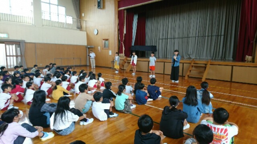 11日朝、体育館で終業式を行いました。児童会代表委員があいさつを述べました。前期を振り返ってよかったところはさらに伸ばしていきましょう。後期の目標やがんばることを決めましょう。休み時間は元気いっぱい外で遊んでいました。台風19号が近づいて来ています。被害が出ないことを祈ります。