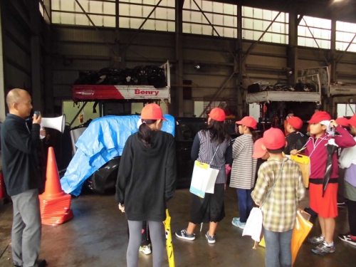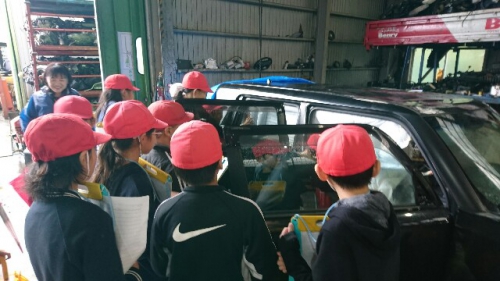 あいにくの雨となりましたが、5年生は本田技研鈴鹿製作所の見学を終え、鈴鹿サーキットのレーシングコースのメインスタンドでお弁当を食べ、班別行動をしました。三重パーツさんに来ました。壊れた車のリサイクルについて学習しました。三重パーツさんの見学を終え、帰路につきました。午後4時前には学校に到着できそうです。ようやく青空が見えてきました。