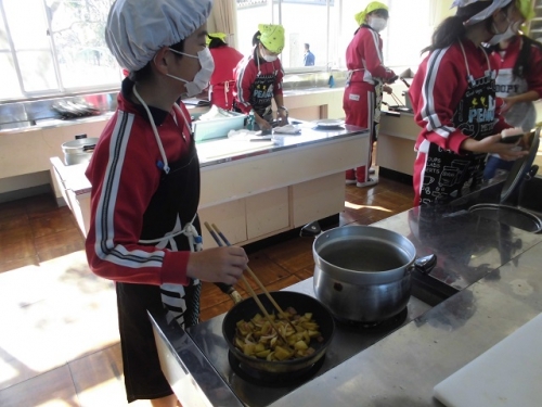 6年生は家庭科の時間に調理実習でジャーマンポテトを作りました。じゃがいもやたまねぎをちょうどよい薄さに切るのが難しかったようです。ベーコンも入れて、野菜がきつね色になるまで炒めて、仕上げに粉チーズをふりかけました。たんぱく質や脂質、炭水化物、ビタミン等栄養のバランスを考えた材料で作りました。美味しくできたかな。