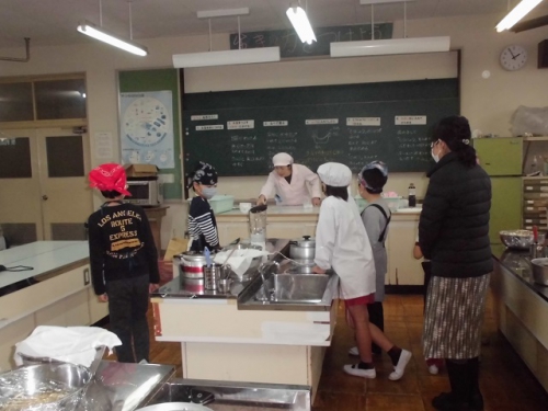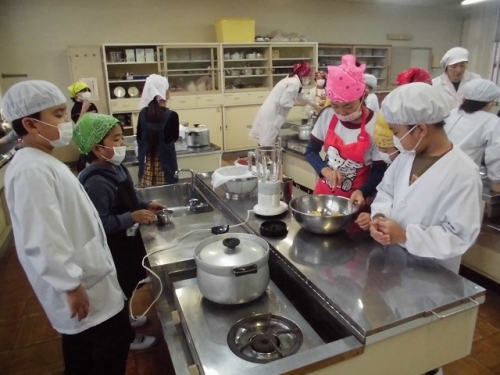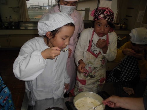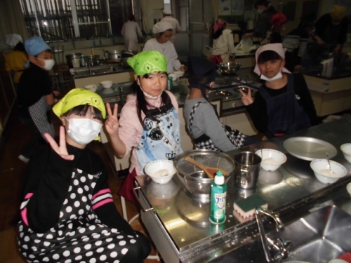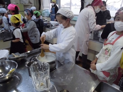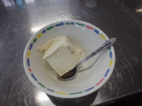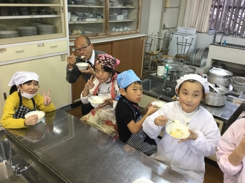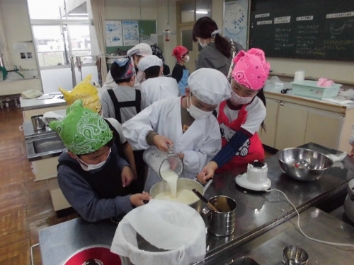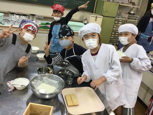 3年生は栄養教諭に来てもらって、豆腐づくりをしました。使う大豆は地域の方に育ててもらって、3年生が収穫したものを使いました。一晩水でふやかした大豆をミキサーにかけて、大豆のエキスを絞り出します。豆乳をしぼって、にがりを入れたら寄せ豆腐ができあがりました。大豆の甘みがしっかりとします。自分たちがさやから取り出した大豆を使ったので、より甘みやうま味を感じたことでしょう。そして型にはめて立派な豆腐が完成しました。できたての豆腐はだし巻きたまごのような食感で、甘みもあり、しょうゆの味にもよく合いました。ごちそうさまでした。