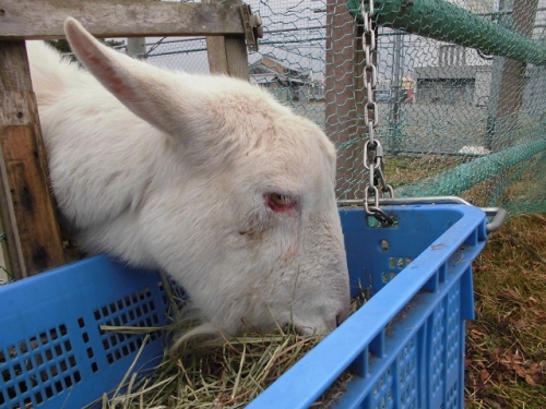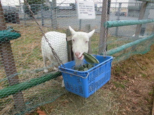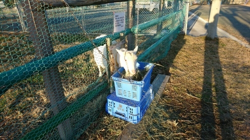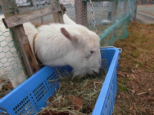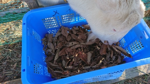 鵲の森の住人、山羊のメイカのエサは主に牧場内に生えている草なのですが、特に冬場は草が枯れてしまうので、エサを補充しなくてはなりません。校区にあるN飼料さんから干し草を購入しています。しかし干し草だけでは飽きて食欲が落ちるので、様々な枯れ葉(栗の葉、柿の葉等)を混ぜてあげています。大根の葉やブロッコリーの葉など水分が多い野菜は干してあげています。教職員が冬休み中も交替でエサやり、水やり、うんち片付けに来ますが、保護者・地域の皆様も引き続き温かくお見守りください。