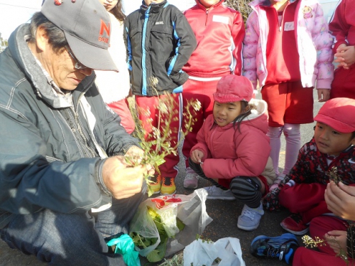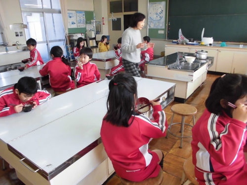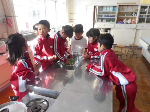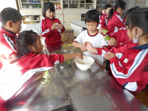 2年生は生活科の時間にゲストティーチャーに来ていただいて、七草がゆを作りました。教室で説明の後、外に出て学校の敷地内で七草を探しました。子どもたちは七草を教えてもらいながら、採りました。そして家庭科室でよく洗ってから、米と一緒に炊きました。七草そろったおかゆって、子どもたちもほとんどの子が初めてのようでしたが、「おいしい、おいしい」と言って何杯もおかわりしていました。日本には1月7日に七草がゆを食べるという風習があります。子どもたちに聞いてみるとそんな機会がどんどん減っているようです。