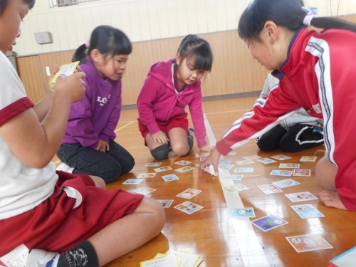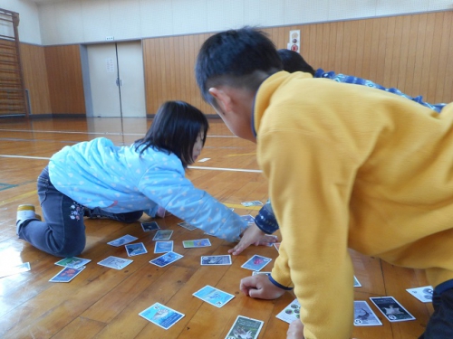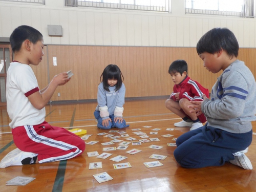 14日に1・2年生は体育館で冬の遊びカルタ取りをしました。子どもたちが持参したものや、学校にある様々なカルタを使って楽しみました。2年生が1年生に優しく接したり、またカルタに夢中になっている姿がとても良かったです。家庭では家族の人数が少なくなってしまって、家族でカルタやトランプなどを楽しむ機会が減ってきているのかも知れません。子どもたちにはとても良い機会になりました。