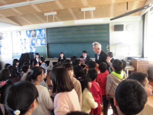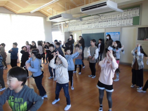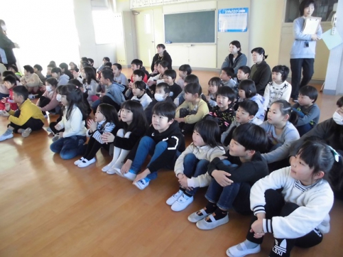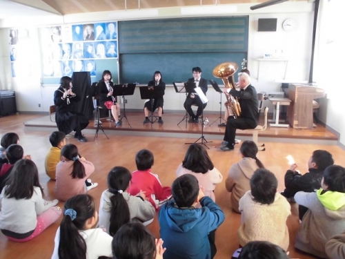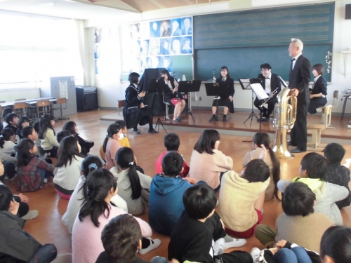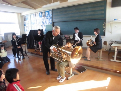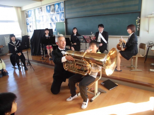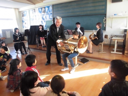 今日は2限目に、校区の鵲ウィンドカルテットさんに来てもらって音楽室で金管楽器演奏を聴いたり、曲に合わせて踊ったり、実際にチューバを吹かせてもらいました。子どもたちのよく知っているアニメの主題歌を演奏してもらったので知っている歌を大きな声で歌ったり、最後はパプリカの演奏に合わせて力一杯踊っていました。そしてアンコールでもう一回パプリカダンスで盛り上がりました。鵲ウィンドカルテットさんの演奏に大喜びでした。ありがとうございました。