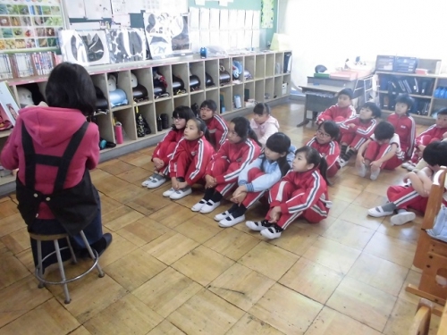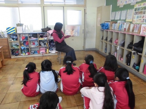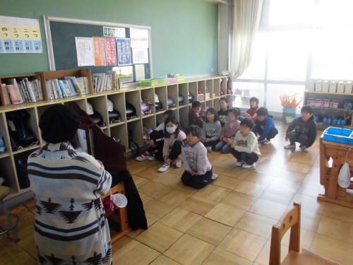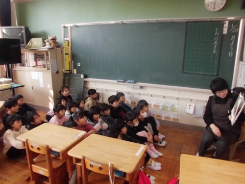 今日は朝読書の時間に、三雲おはなし会さんに来てもらって、1年~3年教室で読み聞かせ等をしてもらいました。暖房の効いた朝の教室の様子のご覧ください。子どもたちが、読み聴かせや紙芝居を整然と聴き入っています。18日の土曜日に鵲ウィンドカルテットさんの演奏でノリノリであった子たちと同じとは思えないほど、落ちついた様子です。子どもたちずいぶんメリハリがつけられるようになってきたと思いました。2年生では「こわめっこ」の絵本を読んでもらいました。「にらめっこ」はおもしろい顔をするのですが、「こわめっこは」恐い顔をするのです。顔の筋肉をほぐすと表情が良くなるそうです。
