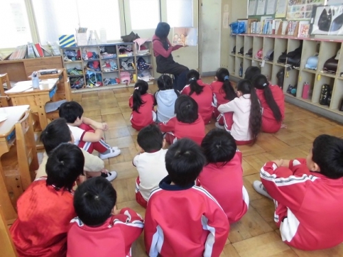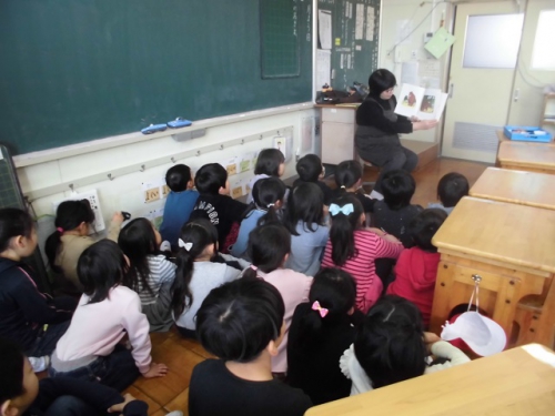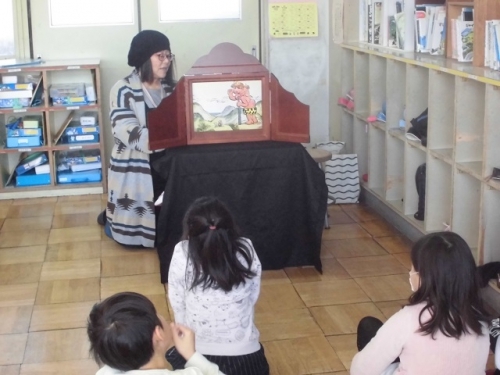 今日は朝読書の時間に、三雲おはなし会さんに来てもらって、1年~3年教室で読み聞かせ等をしてもらいました。暖房の効いた朝の教室の様子のご覧ください。子どもたちが、読み聴かせや紙芝居を整然と聴き入っています。18日の土曜日に鵲ウィンドカルテットさんの演奏でノリノリであった子たちと同じとは思えないほど、落ちついた様子です。子どもたちずいぶんメリハリがつけられるようになってきたと思いました。2年生では「こわめっこ」の絵本を読んでもらいました。「にらめっこ」はおもしろい顔をするのですが、「こわめっこは」恐い顔をするのです。顔の筋肉をほぐすと表情が良くなるそうです。