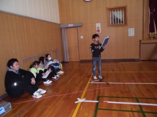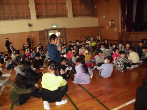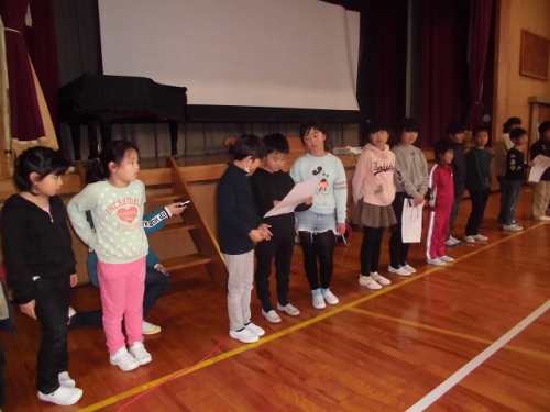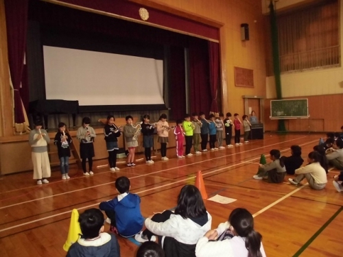 5限目に全校児童が集まって、わくわく仲間集会を行いました。児童会の代表委員の進行で、校歌合唱,生活目標について各学年の取り組み発表をしました。その後環境・園芸委員会より、園芸の紹介やリサイクルの紙の分別の説明、図書委員会より本の紹介がありました。それぞれの委員さんたちが一生懸命呼びかけてくれました。3年生は楽器で「レッツゴー・ソーレ」「聖者の行進」を演奏してくれました。最後に感想を交流して集会を終えました。みんなの前で話をすることがじょうずになってきました。