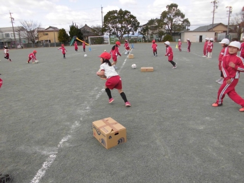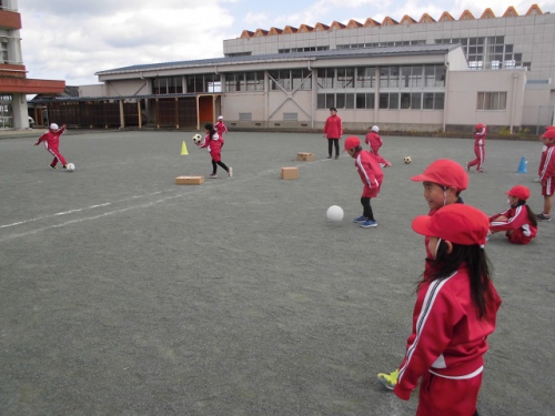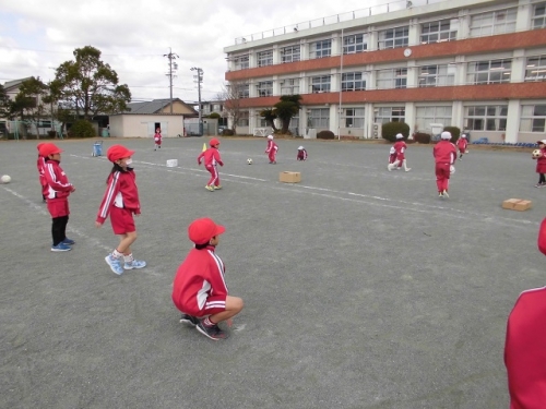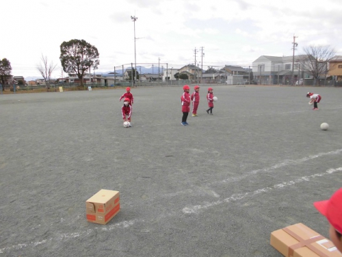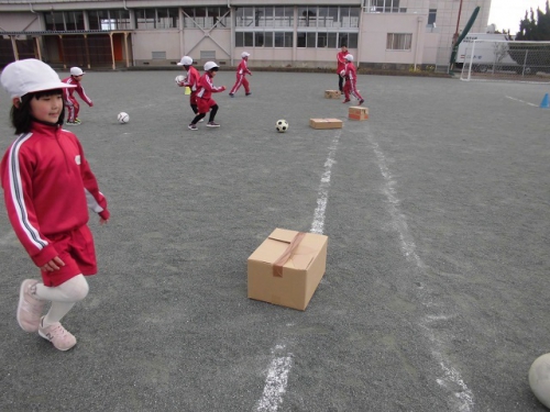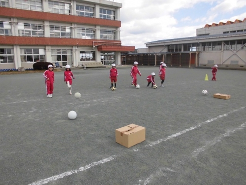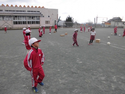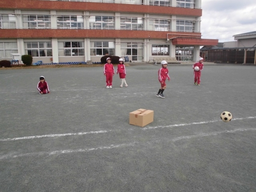 今日は雪もちらついて大変寒い日になりましたが、1年生は運動場で体育をしました。なわとびで身体を暖めてから、サッカーをしました。的に向けてボールをキックして当てるゲーム形式で、赤白対抗で行って、大変楽しそうでした。寒さを吹き飛ばすほど1年生は元気に体育をしていました。
