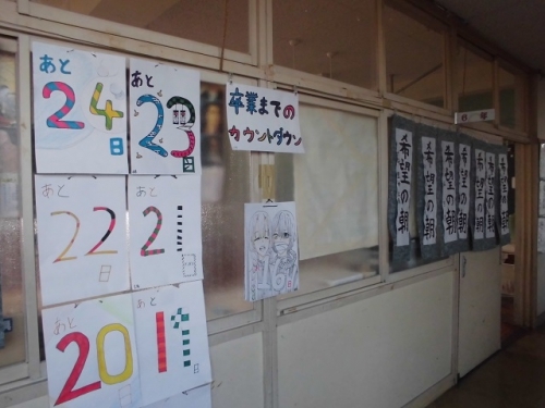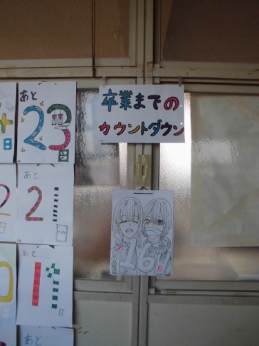 2月も終盤を迎えて、6年生の卒業式までのカウントダウンが始まりました。休日を除くと学校に来る日数も20日を切りました。28日には6年生を送る会が行われます。6年生も卒業に向けて様々なことに取り組んでいていそがしそうです。6年生の教室前のカウントダウン日めくりが力作でした。